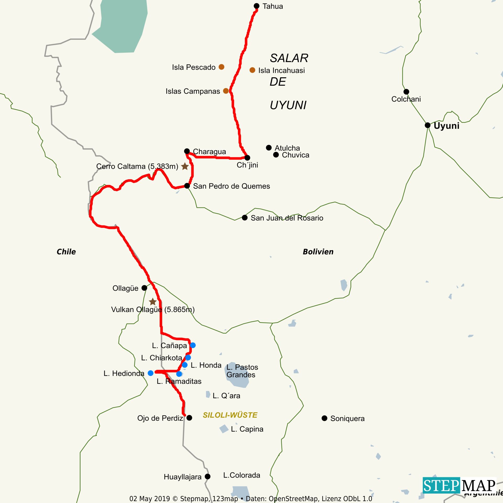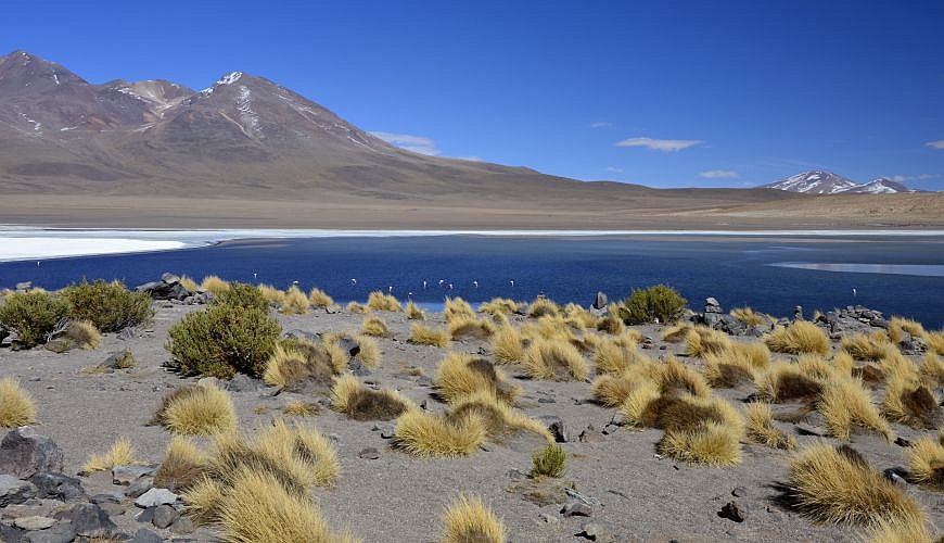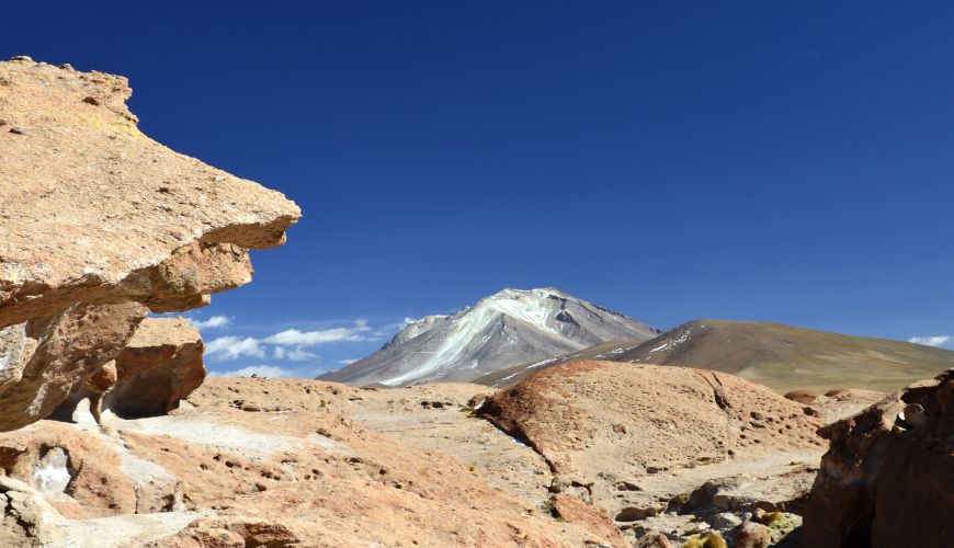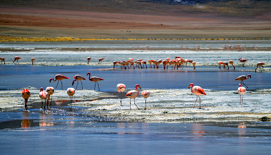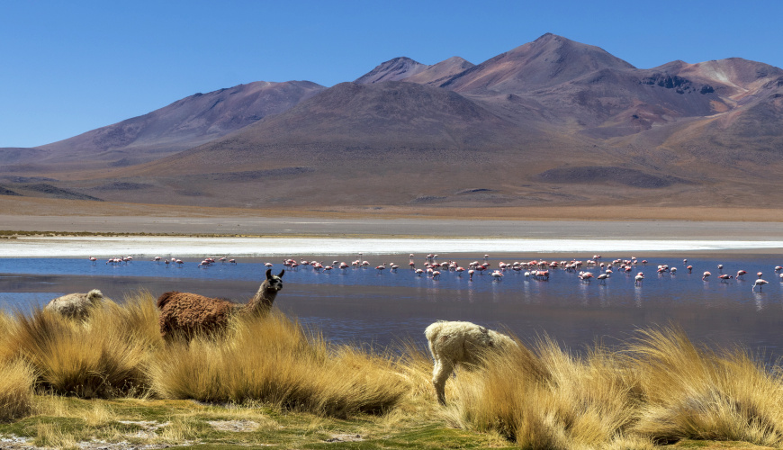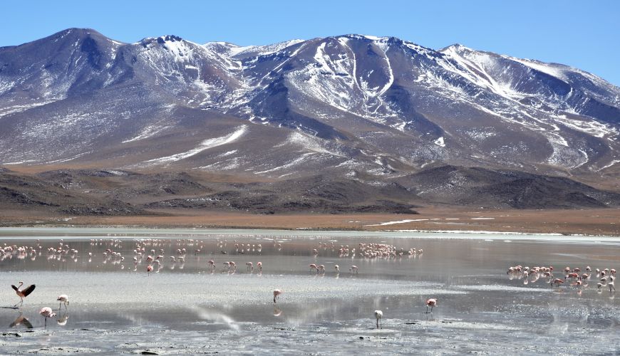 Heute verlassen wir Ojo de Perdiz in der Siloli-Wüste in nördliche Richtung. Die Farben der Landschaft werden sich während der Tour immer wieder ändern. Sie passieren die Lagunen Ramaditas, Honda, Chiarkota, Hedionda und Cañapa, wo man drei der weltweit sechs Flamingoarten sehen kann. Zu Füßen des Vulkan Ollagüe (5.865 m) wird dann zum Lunch gehalten. Dann geht es weiter über Yonza und bei Chargua wird schließlich die endlose Weite des größten Salzsees der Welt, des Salar de Uyuni, erreicht. Wir haben das Privileg, den Salzsee von Süden nach Norden, abseits der touristischen Hauptstrecke, zu überqueren. Dabei passieren wir Coquesa und anschließend erreichen wir unser Hotel in Tahua, welches vor der Kulisse des Vulkans Thunupa (5.432 m) liegt.
